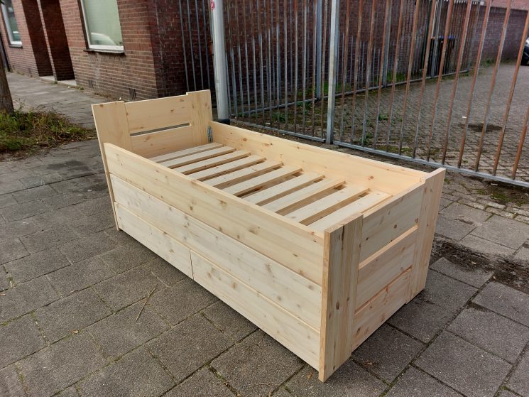 – massief ongelakt grenen- en vurenhout 28mm bovenste bed, 18mm onderschuifbed en laden